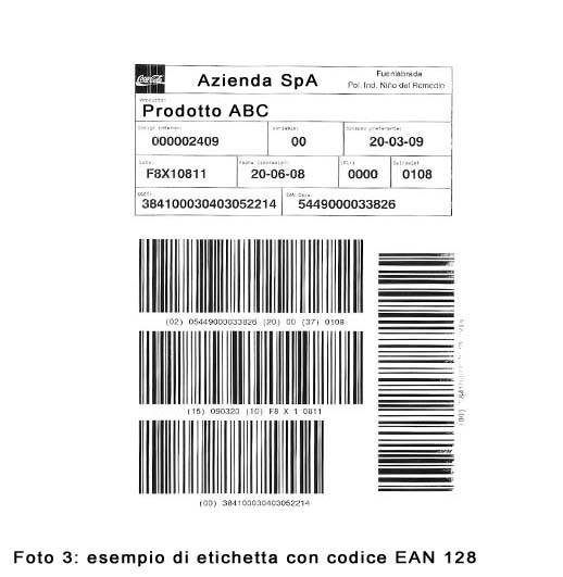 - La parte inferiore contenente i simboli delle barre e la relativa interpretazione in chiaro, cioè l’Application Identifier (tra parentesi) e il campo dati che li segue.