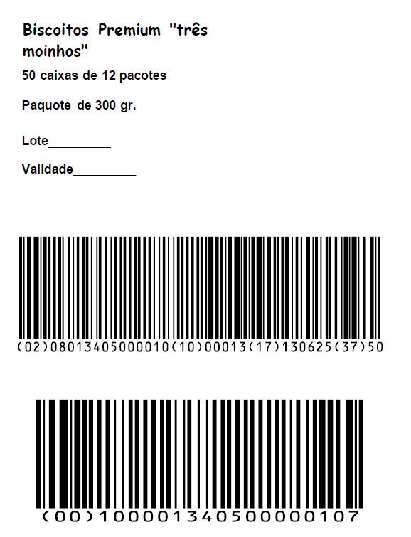 • GTIN (Global Trade Item Number): Código que identifica o artigo comercial (Identificador de Aplicação 02)