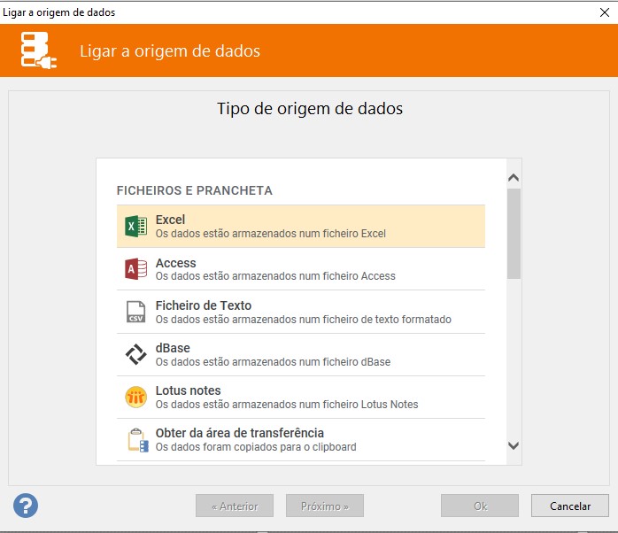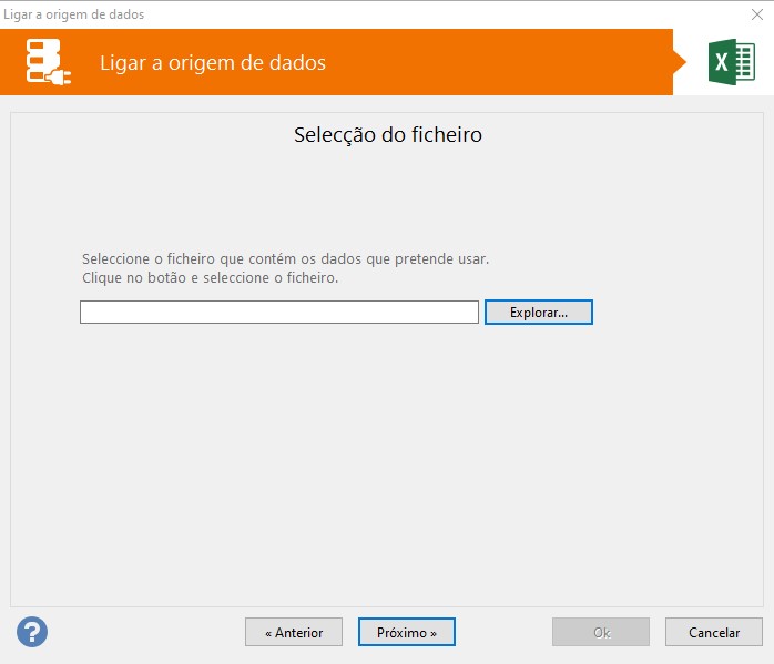 O passo seguinte é criar uma ligação de dados; selecione Excel e prossiga.
