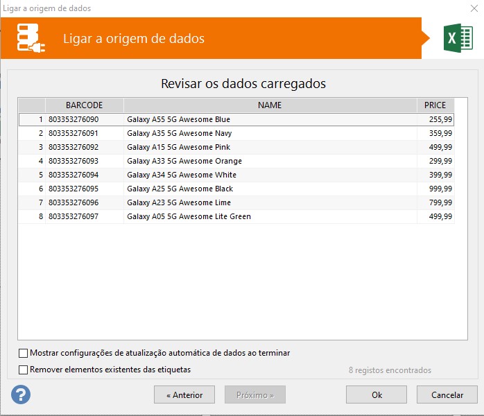 Esta é a pré-visualização dos dados que serão carregados nas etiquetas; será então criada uma etiqueta para cada linha da lista.