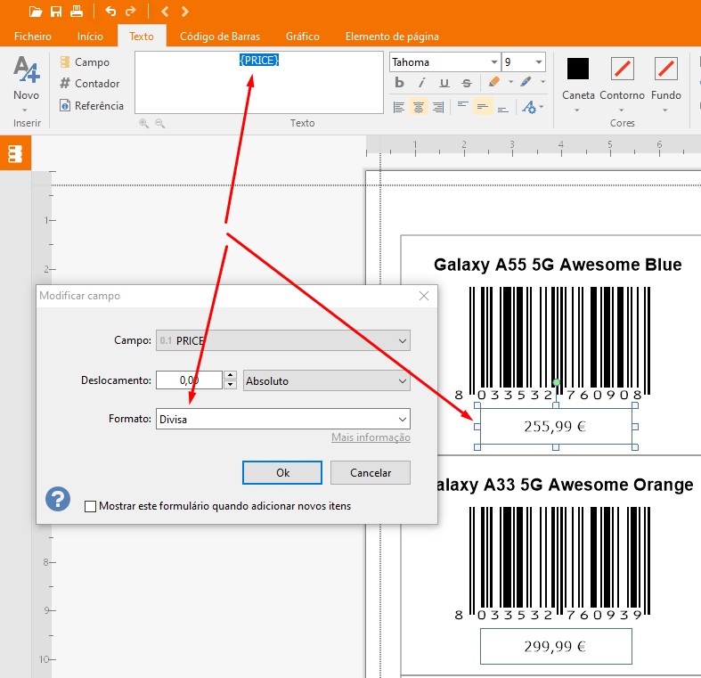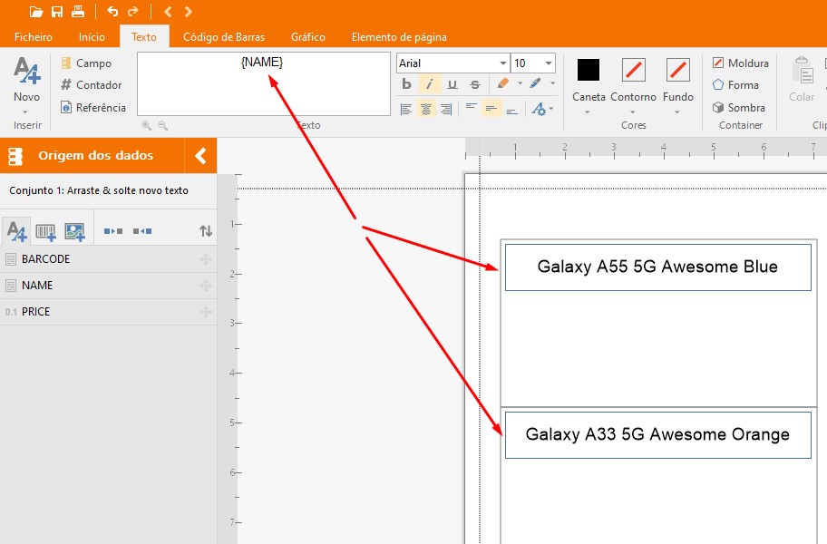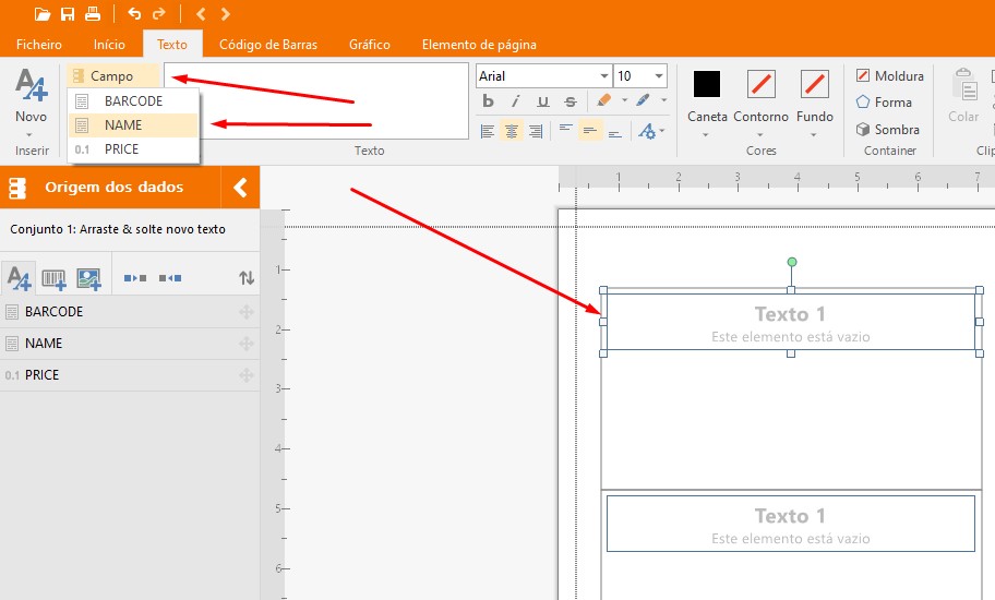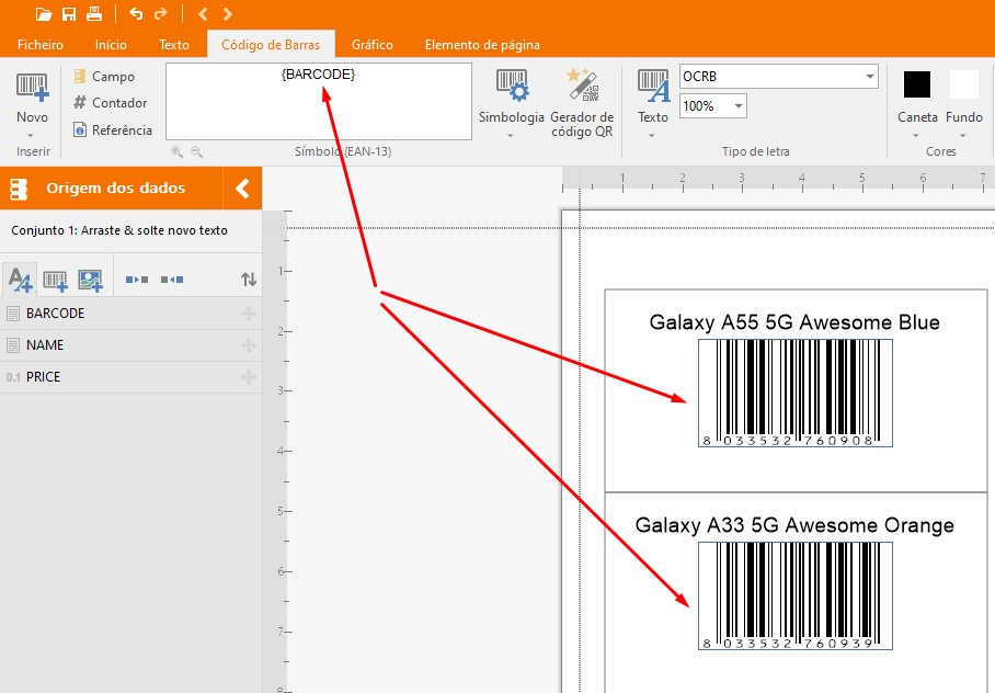 Agora siga o mesmo procedimento para o elemento Código de Barras, selecione o EAN 13 e associe-lhe o campo BARCODE, obtendo o resultado na imagem abaixo.