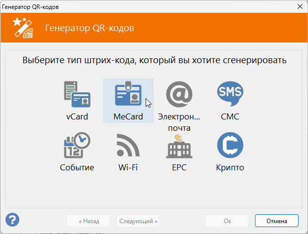 • MeCard: Кодирует MeCard, включая более простой набор данных для обмена личной информацией.