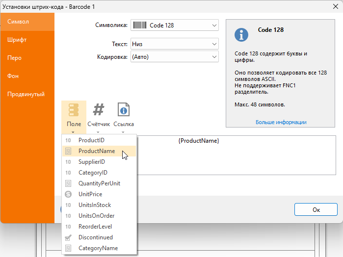 Выберите поле из списка, счетчик или ссылку для замены статического текста.