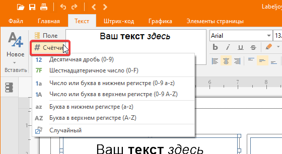 В элементах типа Штрих-код и Текст вы можете объединить текст с одним или несколькими счётчиками: