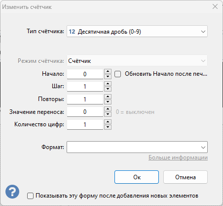 Опция Показывать эту форму при добавлении новых элементов, если она включена, заставит это окно автоматически всплывать сразу после добавления в текст нового счетчика.