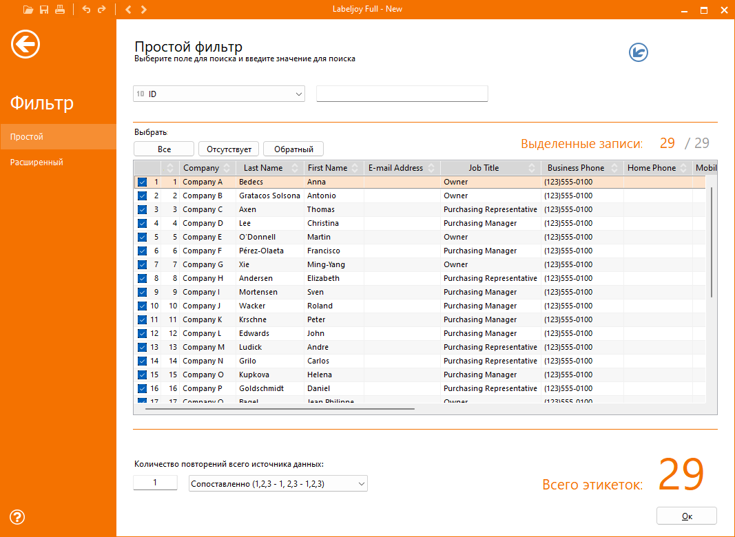 Например, предположим, что вы связали набор с таблицей списка имен, содержащей поле last_name, и хотите использовать только фамилии, содержащие «TH». Выберите Одиночный фильтр, выберите поле last_name и введите буквы TH. Список записей будет отфильтрован в соответствии с этими параметрами и будет отображать только записи, соответствующие заданным критериям, таким как, например, SmiTH, THacker или CaTHedral. Применение фильтра изменит количество этикеток, которые будут отображаться на экране и распечатываться.
