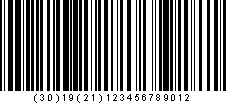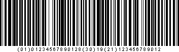 | Символ GS1-128, кодирующий объединение двух идентификаторов приложений: AI 30 (количество каждого) и AI 21 (серийный номер). Обратите внимание, что в этом случае символ-разделитель FNC1 добавляется прямо перед началом AI 21 (не виден в читаемом человеком тексте). |